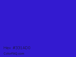 Hex #331ad0 Color is a normal indigo color and the nearest color is Interdimensional Blue #360ccc. Hex code #331ad0 and RGB value is rgb(51,26,208). In RGB color space, this color is composed of 20% red, 10% green, 82% blue, In CMYK color space, this color is composed of 75% cyan, 88% magenta, 0% yellow , 18% black , In HSL color space, this color has a hue angle of 248° , 78% saturation and 46% lightness.