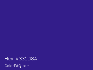 Hex #331d8a Color is a normal indigo color and the nearest color is Pixie Powder #391285. Hex code #331d8a and RGB value is rgb(51,29,138). In RGB color space, this color is composed of 20% red, 11% green, 54% blue, In CMYK color space, this color is composed of 63% cyan, 79% magenta, 0% yellow , 46% black , In HSL color space, this color has a hue angle of 252° , 65% saturation and 33% lightness.