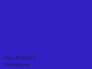 Hex #3320c5 Color is a normal indigo color and the nearest color is Interdimensional Blue #360ccc. Hex code #3320c5 and RGB value is rgb(51,32,197). In RGB color space, this color is composed of 20% red, 13% green, 77% blue, In CMYK color space, this color is composed of 74% cyan, 84% magenta, 0% yellow , 23% black , In HSL color space, this color has a hue angle of 247° , 72% saturation and 45% lightness.