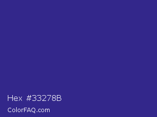 Hex #33278b Color is a normal indigo color and the nearest color is Cosmic Cobalt #2e2d88. Hex code #33278b and RGB value is rgb(51,39,139). In RGB color space, this color is composed of 20% red, 15% green, 55% blue, In CMYK color space, this color is composed of 63% cyan, 72% magenta, 0% yellow , 45% black , In HSL color space, this color has a hue angle of 247° , 56% saturation and 35% lightness.