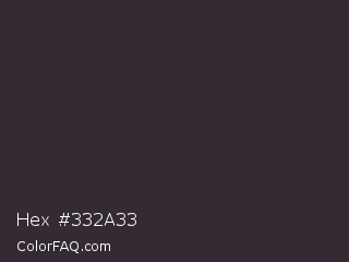 Hex #332a33 Color is a very dark magenta color and the nearest color is Thunder #33292f. Hex code #332a33 and RGB value is rgb(51,42,51). In RGB color space, this color is composed of 20% red, 16% green, 20% blue, In CMYK color space, this color is composed of 0% cyan, 18% magenta, 0% yellow , 80% black , In HSL color space, this color has a hue angle of 300° , 10% saturation and 18% lightness.