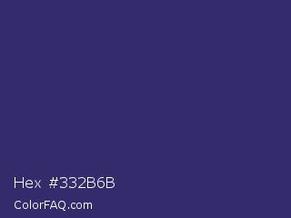 Hex #332b6b Color is a dark indigo color and the nearest color is Jacarta #3a2a6a. Hex code #332b6b and RGB value is rgb(51,43,107). In RGB color space, this color is composed of 20% red, 17% green, 42% blue, In CMYK color space, this color is composed of 52% cyan, 60% magenta, 0% yellow , 58% black , In HSL color space, this color has a hue angle of 248° , 43% saturation and 29% lightness.