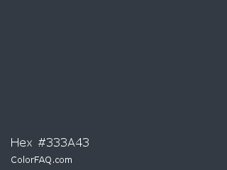 Hex #333a43 Color is a dark blue color and the nearest color is Tuna #353542. Hex code #333a43 and RGB value is rgb(51,58,67). In RGB color space, this color is composed of 20% red, 23% green, 26% blue, In CMYK color space, this color is composed of 24% cyan, 13% magenta, 0% yellow , 74% black , In HSL color space, this color has a hue angle of 214° , 14% saturation and 23% lightness.