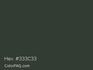 Hex #333c33 Color is a very dark green color and the nearest color is Kombu Green #354230. Hex code #333c33 and RGB value is rgb(51,60,51). In RGB color space, this color is composed of 20% red, 24% green, 20% blue, In CMYK color space, this color is composed of 15% cyan, 0% magenta, 15% yellow , 76% black , In HSL color space, this color has a hue angle of 120° , 8% saturation and 22% lightness.