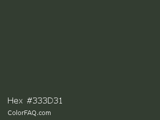 Hex #333d31 Color is a very dark green color and the nearest color is Kombu Green #354230. Hex code #333d31 and RGB value is rgb(51,61,49). In RGB color space, this color is composed of 20% red, 24% green, 19% blue, In CMYK color space, this color is composed of 16% cyan, 0% magenta, 20% yellow , 76% black , In HSL color space, this color has a hue angle of 110° , 11% saturation and 22% lightness.