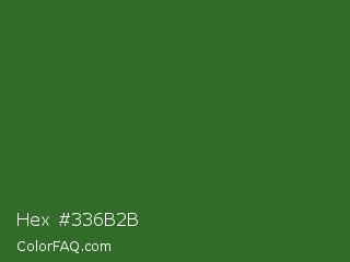 Hex #336b2b Color is a dark green color and the nearest color is Mughal Green #306030. Hex code #336b2b and RGB value is rgb(51,107,43). In RGB color space, this color is composed of 20% red, 42% green, 17% blue, In CMYK color space, this color is composed of 52% cyan, 0% magenta, 60% yellow , 58% black , In HSL color space, this color has a hue angle of 113° , 43% saturation and 29% lightness.