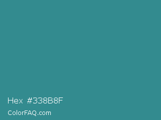 Hex #338b8f Color is a normal cyan color and the nearest color is Lochinvar #2c8c84. Hex code #338b8f and RGB value is rgb(51,139,143). In RGB color space, this color is composed of 20% red, 55% green, 56% blue, In CMYK color space, this color is composed of 64% cyan, 3% magenta, 0% yellow , 44% black , In HSL color space, this color has a hue angle of 183° , 47% saturation and 38% lightness.
