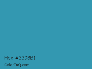 Hex #3398b1 Color is a normal cyan color and the nearest color is Boston Blue #3b91b4. Hex code #3398b1 and RGB value is rgb(51,152,177). In RGB color space, this color is composed of 20% red, 60% green, 69% blue, In CMYK color space, this color is composed of 71% cyan, 14% magenta, 0% yellow , 31% black , In HSL color space, this color has a hue angle of 192° , 55% saturation and 45% lightness.