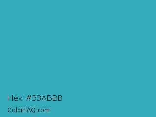 Hex #33abbb Color is a normal cyan color and the nearest color is Pelorous #3eabbf. Hex code #33abbb and RGB value is rgb(51,171,187). In RGB color space, this color is composed of 20% red, 67% green, 73% blue, In CMYK color space, this color is composed of 73% cyan, 9% magenta, 0% yellow , 27% black , In HSL color space, this color has a hue angle of 187° , 57% saturation and 47% lightness.