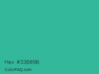 Hex #33b89b Color is a normal cyan color and the nearest color is Keppel #3ab09e. Hex code #33b89b and RGB value is rgb(51,184,155). In RGB color space, this color is composed of 20% red, 72% green, 61% blue, In CMYK color space, this color is composed of 72% cyan, 0% magenta, 16% yellow , 28% black , In HSL color space, this color has a hue angle of 167° , 57% saturation and 46% lightness.