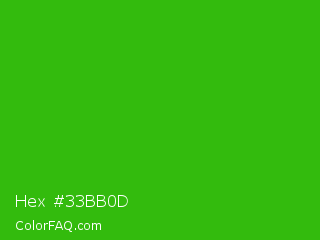 Hex #33bb0d Color is a normal green color and the nearest color is Kelly Green #4cbb17. Hex code #33bb0d and RGB value is rgb(51,187,13). In RGB color space, this color is composed of 20% red, 73% green, 5% blue, In CMYK color space, this color is composed of 73% cyan, 0% magenta, 93% yellow , 27% black , In HSL color space, this color has a hue angle of 107° , 87% saturation and 39% lightness.