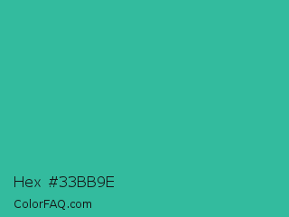 Hex #33bb9e Color is a normal cyan color and the nearest color is Keppel #3ab09e. Hex code #33bb9e and RGB value is rgb(51,187,158). In RGB color space, this color is composed of 20% red, 73% green, 62% blue, In CMYK color space, this color is composed of 73% cyan, 0% magenta, 16% yellow , 27% black , In HSL color space, this color has a hue angle of 167° , 57% saturation and 47% lightness.