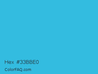 Hex #33bbe0 Color is a normal cyan color and the nearest color is Scooter #2ebfd4. Hex code #33bbe0 and RGB value is rgb(51,187,224). In RGB color space, this color is composed of 20% red, 73% green, 88% blue, In CMYK color space, this color is composed of 77% cyan, 17% magenta, 0% yellow , 12% black , In HSL color space, this color has a hue angle of 193° , 74% saturation and 54% lightness.
