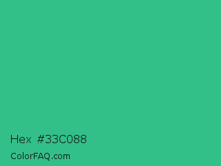 Hex #33c088 Color is a normal green color and the nearest color is Mountain Meadow #30ba8f. Hex code #33c088 and RGB value is rgb(51,192,136). In RGB color space, this color is composed of 20% red, 75% green, 53% blue, In CMYK color space, this color is composed of 73% cyan, 0% magenta, 29% yellow , 25% black , In HSL color space, this color has a hue angle of 156° , 58% saturation and 48% lightness.
