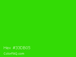 Hex #33db05 Color is a normal green color and the nearest color is Harlequin Green #46cb18. Hex code #33db05 and RGB value is rgb(51,219,5). In RGB color space, this color is composed of 20% red, 86% green, 2% blue, In CMYK color space, this color is composed of 77% cyan, 0% magenta, 98% yellow , 14% black , In HSL color space, this color has a hue angle of 107° , 96% saturation and 44% lightness.