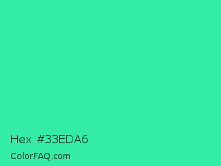 Hex #33eda6 Color is a normal green color and the nearest color is Eucalyptus #44d7a8. Hex code #33eda6 and RGB value is rgb(51,237,166). In RGB color space, this color is composed of 20% red, 93% green, 65% blue, In CMYK color space, this color is composed of 78% cyan, 0% magenta, 30% yellow , 7% black , In HSL color space, this color has a hue angle of 157° , 84% saturation and 56% lightness.