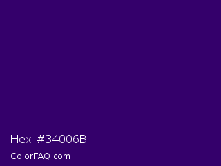 Hex #34006b Color is a very dark violet color and the nearest color is Christalle #33036b. Hex code #34006b and RGB value is rgb(52,0,107). In RGB color space, this color is composed of 20% red, 0% green, 42% blue, In CMYK color space, this color is composed of 51% cyan, 100% magenta, 0% yellow , 58% black , In HSL color space, this color has a hue angle of 269° , 100% saturation and 21% lightness.