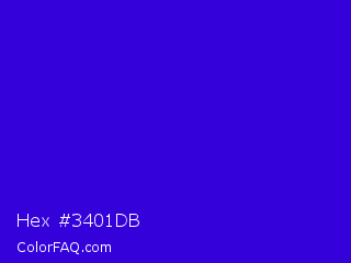 Hex #3401db Color is a normal indigo color and the nearest color is Interdimensional Blue #360ccc. Hex code #3401db and RGB value is rgb(52,1,219). In RGB color space, this color is composed of 20% red, 0% green, 86% blue, In CMYK color space, this color is composed of 76% cyan, 100% magenta, 0% yellow , 14% black , In HSL color space, this color has a hue angle of 254° , 99% saturation and 43% lightness.