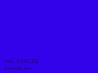 Hex #3401eb Color is a normal indigo color and the nearest color is Electric Ultramarine #3f00ff. Hex code #3401eb and RGB value is rgb(52,1,235). In RGB color space, this color is composed of 20% red, 0% green, 92% blue, In CMYK color space, this color is composed of 78% cyan, 100% magenta, 0% yellow , 8% black , In HSL color space, this color has a hue angle of 253° , 99% saturation and 46% lightness.