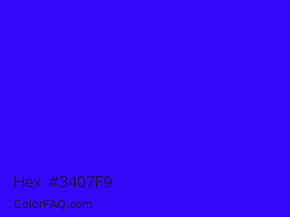 Hex #3407f9 Color is a normal indigo color and the nearest color is Electric Ultramarine #3f00ff. Hex code #3407f9 and RGB value is rgb(52,7,249). In RGB color space, this color is composed of 20% red, 3% green, 98% blue, In CMYK color space, this color is composed of 79% cyan, 97% magenta, 0% yellow , 2% black , In HSL color space, this color has a hue angle of 251° , 95% saturation and 50% lightness.