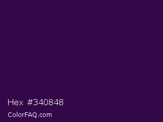 Hex #340848 Color is a very dark purple color and the nearest color is Valentino #350e42. Hex code #340848 and RGB value is rgb(52,8,72). In RGB color space, this color is composed of 20% red, 3% green, 28% blue, In CMYK color space, this color is composed of 28% cyan, 89% magenta, 0% yellow , 72% black , In HSL color space, this color has a hue angle of 281° , 80% saturation and 16% lightness.