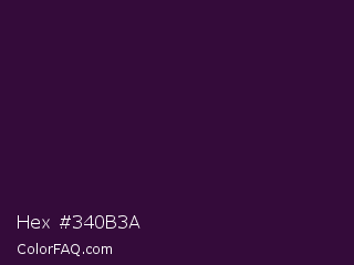 Hex #340b3a Color is a very dark magenta color and the nearest color is Valentino #350e42. Hex code #340b3a and RGB value is rgb(52,11,58). In RGB color space, this color is composed of 20% red, 4% green, 23% blue, In CMYK color space, this color is composed of 10% cyan, 81% magenta, 0% yellow , 77% black , In HSL color space, this color has a hue angle of 292° , 68% saturation and 14% lightness.
