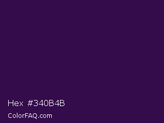 Hex #340b4b Color is a very dark purple color and the nearest color is Valentino #350e42. Hex code #340b4b and RGB value is rgb(52,11,75). In RGB color space, this color is composed of 20% red, 4% green, 29% blue, In CMYK color space, this color is composed of 31% cyan, 85% magenta, 0% yellow , 71% black , In HSL color space, this color has a hue angle of 278° , 74% saturation and 17% lightness.
