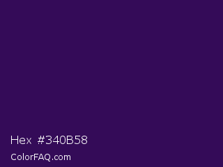 Hex #340b58 Color is a very dark purple color and the nearest color is Jagger #350e57. Hex code #340b58 and RGB value is rgb(52,11,88). In RGB color space, this color is composed of 20% red, 4% green, 35% blue, In CMYK color space, this color is composed of 41% cyan, 88% magenta, 0% yellow , 65% black , In HSL color space, this color has a hue angle of 272° , 78% saturation and 19% lightness.