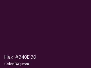 Hex #340d30 Color is a very dark magenta color and the nearest color is Melanzane #300529. Hex code #340d30 and RGB value is rgb(52,13,48). In RGB color space, this color is composed of 20% red, 5% green, 19% blue, In CMYK color space, this color is composed of 0% cyan, 75% magenta, 8% yellow , 80% black , In HSL color space, this color has a hue angle of 306° , 60% saturation and 13% lightness.