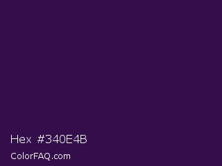 Hex #340e4b Color is a very dark purple color and the nearest color is Valentino #350e42. Hex code #340e4b and RGB value is rgb(52,14,75). In RGB color space, this color is composed of 20% red, 5% green, 29% blue, In CMYK color space, this color is composed of 31% cyan, 81% magenta, 0% yellow , 71% black , In HSL color space, this color has a hue angle of 277° , 69% saturation and 17% lightness.