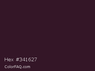 Hex #341627 Color is a very dark magenta color and the nearest color is Cocoa Brown #301f1e. Hex code #341627 and RGB value is rgb(52,22,39). In RGB color space, this color is composed of 20% red, 9% green, 15% blue, In CMYK color space, this color is composed of 0% cyan, 58% magenta, 25% yellow , 80% black , In HSL color space, this color has a hue angle of 326° , 41% saturation and 15% lightness.