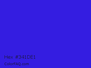 Hex #341de1 Color is a normal indigo color and the nearest color is Interdimensional Blue #360ccc. Hex code #341de1 and RGB value is rgb(52,29,225). In RGB color space, this color is composed of 20% red, 11% green, 88% blue, In CMYK color space, this color is composed of 77% cyan, 87% magenta, 0% yellow , 12% black , In HSL color space, this color has a hue angle of 247° , 77% saturation and 50% lightness.