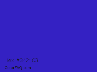 Hex #3421c3 Color is a normal indigo color and the nearest color is Interdimensional Blue #360ccc. Hex code #3421c3 and RGB value is rgb(52,33,195). In RGB color space, this color is composed of 20% red, 13% green, 76% blue, In CMYK color space, this color is composed of 73% cyan, 83% magenta, 0% yellow , 24% black , In HSL color space, this color has a hue angle of 247° , 71% saturation and 45% lightness.