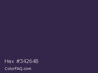 Hex #34264b Color is a very dark violet color and the nearest color is Martinique #363050. Hex code #34264b and RGB value is rgb(52,38,75). In RGB color space, this color is composed of 20% red, 15% green, 29% blue, In CMYK color space, this color is composed of 31% cyan, 49% magenta, 0% yellow , 71% black , In HSL color space, this color has a hue angle of 263° , 33% saturation and 22% lightness.