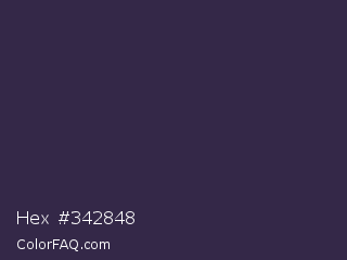 Hex #342848 Color is a very dark violet color and the nearest color is Martinique #363050. Hex code #342848 and RGB value is rgb(52,40,72). In RGB color space, this color is composed of 20% red, 16% green, 28% blue, In CMYK color space, this color is composed of 28% cyan, 44% magenta, 0% yellow , 72% black , In HSL color space, this color has a hue angle of 263° , 29% saturation and 22% lightness.