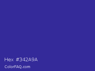 Hex #342a9a Color is a normal indigo color and the nearest color is Blue Pigment #333399. Hex code #342a9a and RGB value is rgb(52,42,154). In RGB color space, this color is composed of 20% red, 16% green, 60% blue, In CMYK color space, this color is composed of 66% cyan, 73% magenta, 0% yellow , 40% black , In HSL color space, this color has a hue angle of 245° , 57% saturation and 38% lightness.