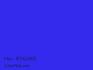 Hex #342aee Color is a normal indigo color and the nearest color is Palatinate Blue #273be2. Hex code #342aee and RGB value is rgb(52,42,238). In RGB color space, this color is composed of 20% red, 16% green, 93% blue, In CMYK color space, this color is composed of 78% cyan, 82% magenta, 0% yellow , 7% black , In HSL color space, this color has a hue angle of 243° , 85% saturation and 55% lightness.