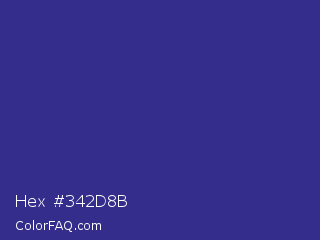 Hex #342d8b Color is a normal indigo color and the nearest color is Cosmic Cobalt #2e2d88. Hex code #342d8b and RGB value is rgb(52,45,139). In RGB color space, this color is composed of 20% red, 18% green, 55% blue, In CMYK color space, this color is composed of 63% cyan, 68% magenta, 0% yellow , 45% black , In HSL color space, this color has a hue angle of 244° , 51% saturation and 36% lightness.