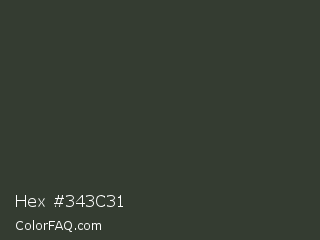 Hex #343c31 Color is a very dark green color and the nearest color is Kombu Green #354230. Hex code #343c31 and RGB value is rgb(52,60,49). In RGB color space, this color is composed of 20% red, 24% green, 19% blue, In CMYK color space, this color is composed of 13% cyan, 0% magenta, 18% yellow , 76% black , In HSL color space, this color has a hue angle of 104° , 10% saturation and 21% lightness.