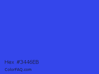 Hex #3446eb Color is a normal blue color and the nearest color is Palatinate Blue #273be2. Hex code #3446eb and RGB value is rgb(52,70,235). In RGB color space, this color is composed of 20% red, 27% green, 92% blue, In CMYK color space, this color is composed of 78% cyan, 70% magenta, 0% yellow , 8% black , In HSL color space, this color has a hue angle of 234° , 82% saturation and 56% lightness.