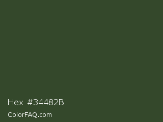 Hex #34482b Color is a dark green color and the nearest color is Kombu Green #354230. Hex code #34482b and RGB value is rgb(52,72,43). In RGB color space, this color is composed of 20% red, 28% green, 17% blue, In CMYK color space, this color is composed of 28% cyan, 0% magenta, 40% yellow , 72% black , In HSL color space, this color has a hue angle of 101° , 25% saturation and 23% lightness.