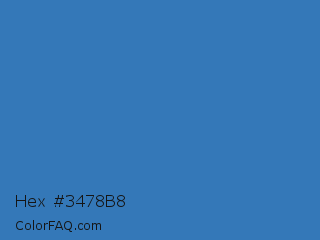 Hex #3478b8 Color is a normal blue color and the nearest color is Steel Blue #4682b4. Hex code #3478b8 and RGB value is rgb(52,120,184). In RGB color space, this color is composed of 20% red, 47% green, 72% blue, In CMYK color space, this color is composed of 72% cyan, 35% magenta, 0% yellow , 28% black , In HSL color space, this color has a hue angle of 209° , 56% saturation and 46% lightness.