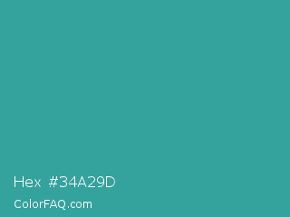 Hex #34a29d Color is a normal cyan color and the nearest color is Keppel #3ab09e. Hex code #34a29d and RGB value is rgb(52,162,157). In RGB color space, this color is composed of 20% red, 64% green, 62% blue, In CMYK color space, this color is composed of 68% cyan, 0% magenta, 3% yellow , 36% black , In HSL color space, this color has a hue angle of 177° , 51% saturation and 42% lightness.