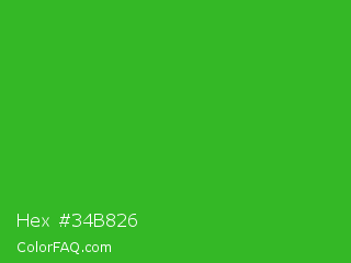 Hex #34b826 Color is a normal green color and the nearest color is Wageningen Green #34b233. Hex code #34b826 and RGB value is rgb(52,184,38). In RGB color space, this color is composed of 20% red, 72% green, 15% blue, In CMYK color space, this color is composed of 72% cyan, 0% magenta, 79% yellow , 28% black , In HSL color space, this color has a hue angle of 114° , 66% saturation and 44% lightness.