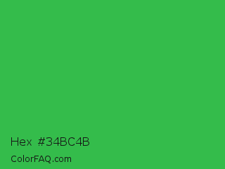 Hex #34bc4b Color is a normal green color and the nearest color is Wageningen Green #34b233. Hex code #34bc4b and RGB value is rgb(52,188,75). In RGB color space, this color is composed of 20% red, 74% green, 29% blue, In CMYK color space, this color is composed of 72% cyan, 0% magenta, 60% yellow , 26% black , In HSL color space, this color has a hue angle of 130° , 57% saturation and 47% lightness.