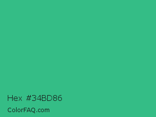 Hex #34bd86 Color is a normal green color and the nearest color is Mountain Meadow #30ba8f. Hex code #34bd86 and RGB value is rgb(52,189,134). In RGB color space, this color is composed of 20% red, 74% green, 53% blue, In CMYK color space, this color is composed of 72% cyan, 0% magenta, 29% yellow , 26% black , In HSL color space, this color has a hue angle of 156° , 57% saturation and 47% lightness.