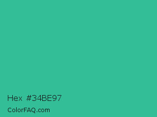 Hex #34be97 Color is a normal green color and the nearest color is Mountain Meadow #30ba8f. Hex code #34be97 and RGB value is rgb(52,190,151). In RGB color space, this color is composed of 20% red, 75% green, 59% blue, In CMYK color space, this color is composed of 73% cyan, 0% magenta, 21% yellow , 25% black , In HSL color space, this color has a hue angle of 163° , 57% saturation and 47% lightness.