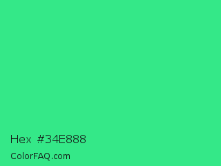 Hex #34e888 Color is a normal green color and the nearest color is Shamrock #33cc99. Hex code #34e888 and RGB value is rgb(52,232,136). In RGB color space, this color is composed of 20% red, 91% green, 53% blue, In CMYK color space, this color is composed of 78% cyan, 0% magenta, 41% yellow , 9% black , In HSL color space, this color has a hue angle of 148° , 80% saturation and 56% lightness.