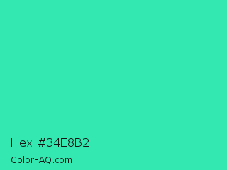 Hex #34e8b2 Color is a normal green color and the nearest color is Eucalyptus #44d7a8. Hex code #34e8b2 and RGB value is rgb(52,232,178). In RGB color space, this color is composed of 20% red, 91% green, 70% blue, In CMYK color space, this color is composed of 78% cyan, 0% magenta, 23% yellow , 9% black , In HSL color space, this color has a hue angle of 162° , 80% saturation and 56% lightness.
