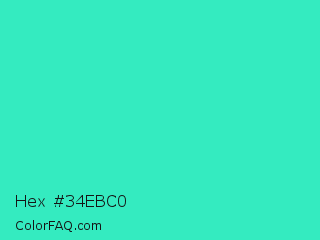 Hex #34ebc0 Color is a normal cyan color and the nearest color is Turquoise #40e0d0. Hex code #34ebc0 and RGB value is rgb(52,235,192). In RGB color space, this color is composed of 20% red, 92% green, 75% blue, In CMYK color space, this color is composed of 78% cyan, 0% magenta, 18% yellow , 8% black , In HSL color space, this color has a hue angle of 166° , 82% saturation and 56% lightness.